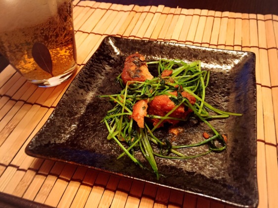 ① 豆苗をゴマ油でさっと炒めます。
