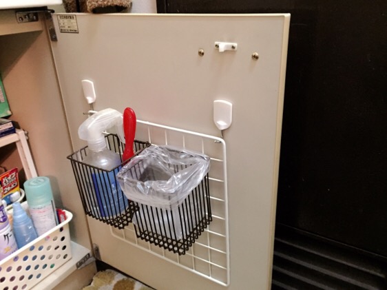 我が家の開きにはかごが付いてなかったので百均でワイヤーネットと引っかけるのが付いたかごを買って来て、このように!(^^)!
