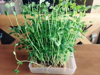 豆苗って一回目使う時ちょっと上目で切ってまた水につけると、生えてくるんです。